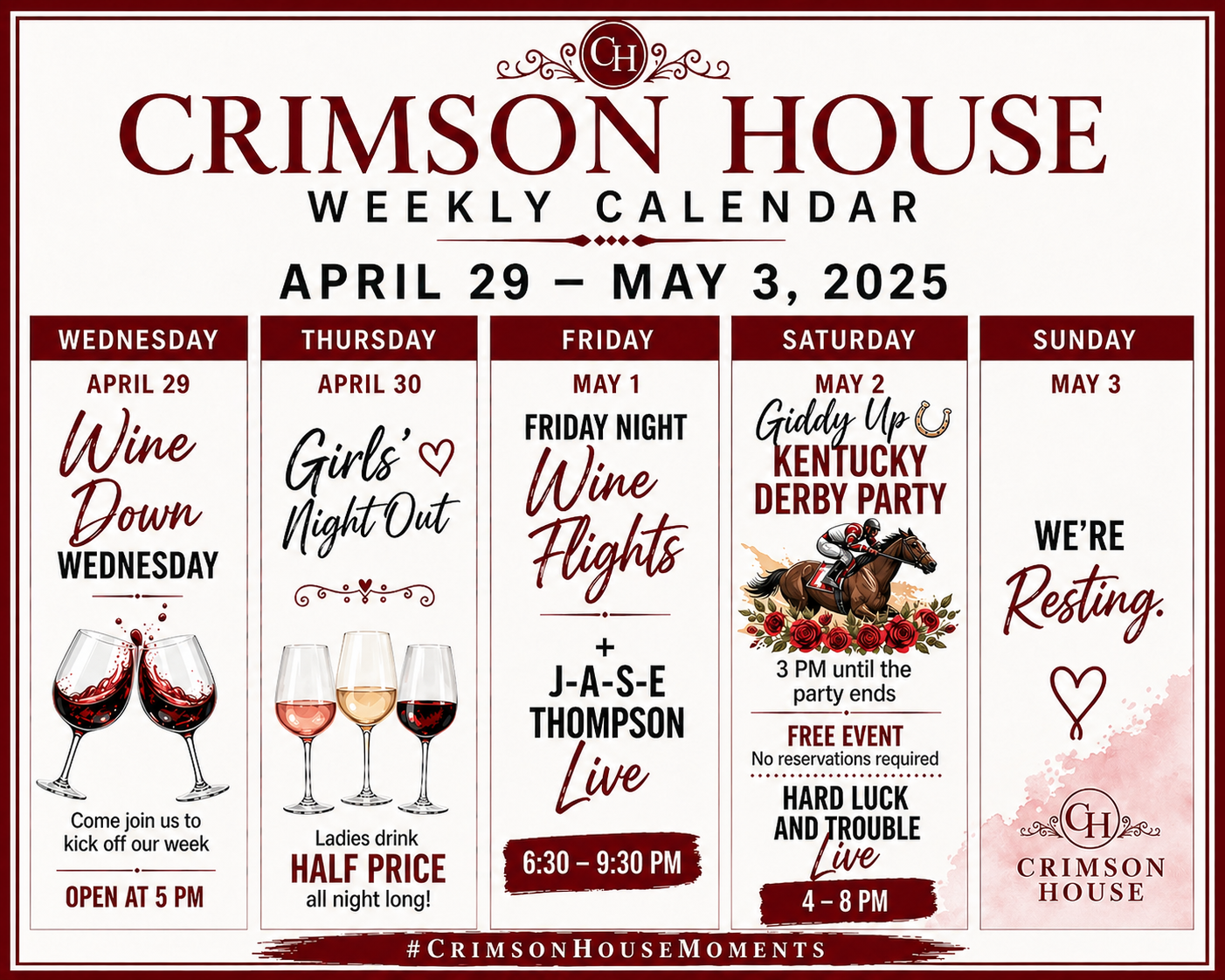 There’s always something going on. Here's what's happening this week at Crimson House — grab a glass, bring a friend, and join us.